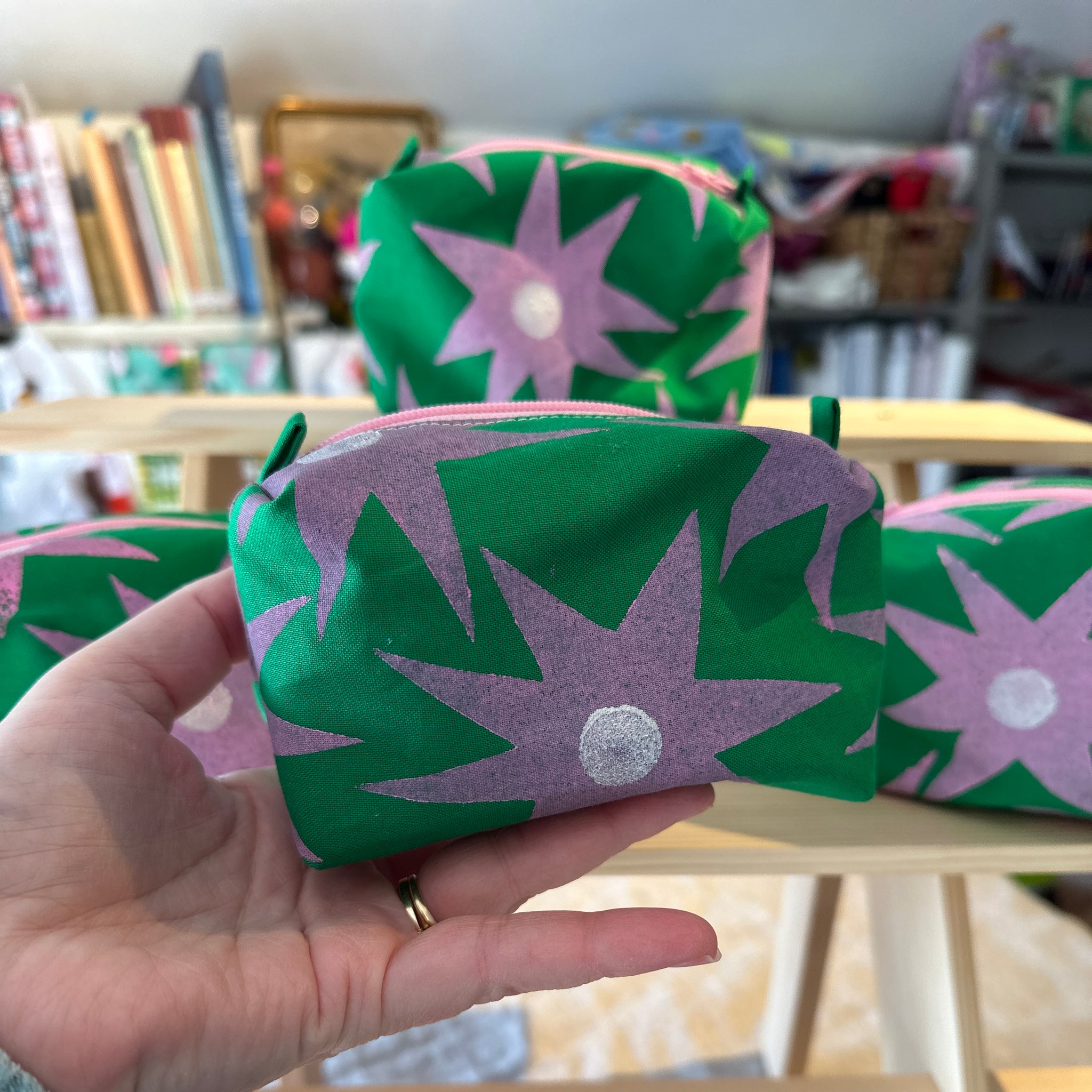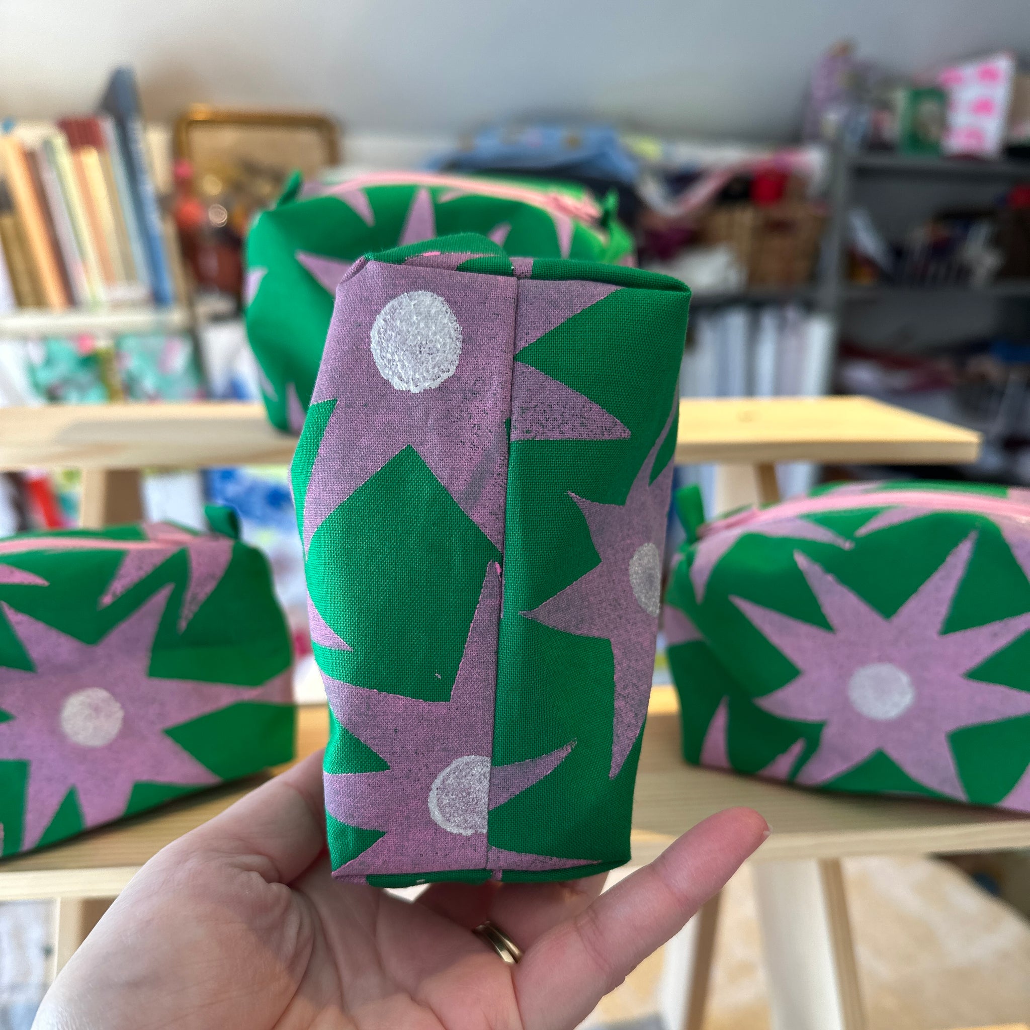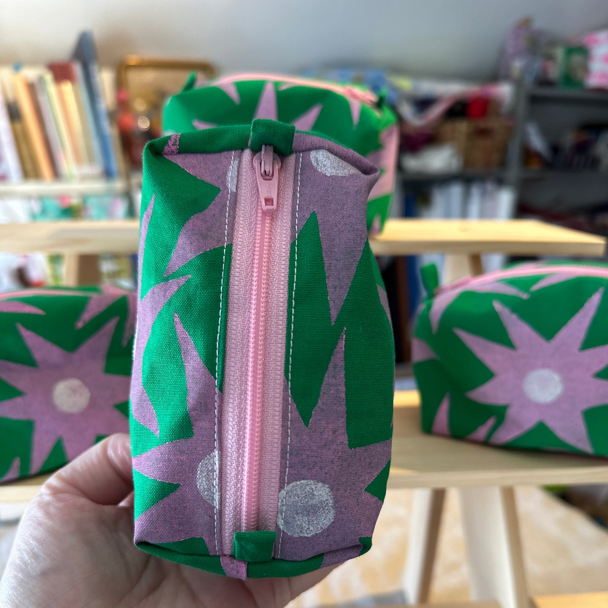 Mini boxy bottom notions bag - Green with pink stars
